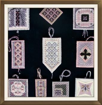 A delightful collection of ten small ornaments in a sweet variety of shapes and sizes, worked on 18 mesh canvas. Stitched in antique mauve, pink, and chocolate tones using a lovely variety of stitches and fibres. Metallic braids and crystals add sparkle. The Lacy Binding Stitch is illustrated for finishing.