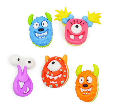 Just mad for monsters! Five colorful goofy friends perfect for for embellishing fun crafts like magnets, Halloween crafts, and more.