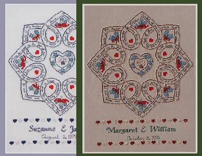 A lovely knot-inspired design with plenty of hearts. Great for a wedding or anniversary sampler - simple yet elegant.
